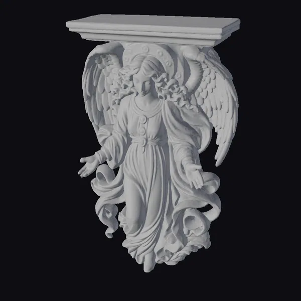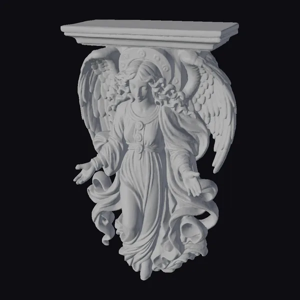 The Heavenly Guardian Console model presents a captivating blend of functionality and divine artistry. The angel, with her curly blonde hair and soft, rosy complexion, stands poised with outstretched hands, as if guiding the console table that floats above her. Her white gown flows elegantly, complemented by a vibrant red sash and matching belt adorned with golden accents. Large, feathered wings sprout from her back, adding a sense of dynamic movement. The console table itself boasts a warm, wooden texture, complete with subtle grain details. This model is perfect for enhancing 3D environments, animations, or architectural visualizations where a touch of the divine is desired. Its detailed craftsmanship makes it suitable for close-up shots or as a focal point in larger scenes.