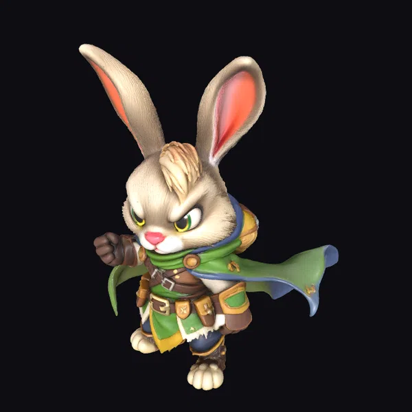 Standing tall with an air of confidence, this heroic rabbit adventurer is captured in a dynamic pose, with one fist clenched and a flowing green scarf billowing behind. The character’s stylized features are meticulously detailed, from the texture of its fur to the intricate design on its attire. The chibi-style exaggeration of its eyes and facial expression gives it a unique, endearing quality. This model is perfect for projects requiring a blend of fantasy and adventure, such as games, animations, or virtual reality experiences. Its detailed and stylized design ensures it will stand out in any scene.