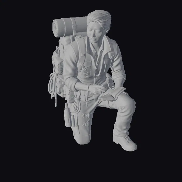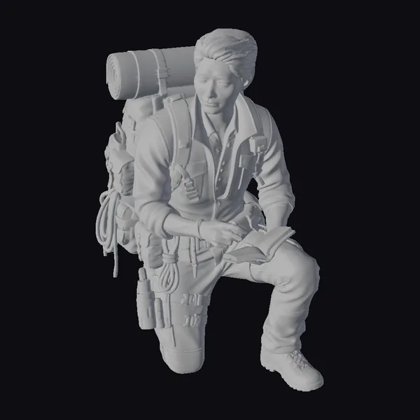 Rendered in exquisite detail, the hiker crouches on one knee, his eyes scanning the map spread across his knee. The large backpack, complete with rolled sleeping bag and water bottle, speaks to extensive travel. His outfit, a mix of olive greens and browns, blends with the earthy tones of his gear. The map, held carefully in his hands, suggests a moment of planning or reflection. This model is perfect for projects requiring a realistic, adventurous character, suitable for use in games, animations, or architectural visualizations where a human element is needed.