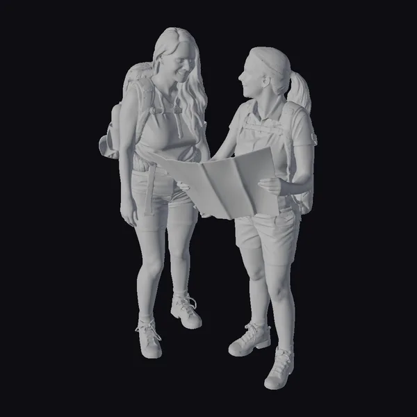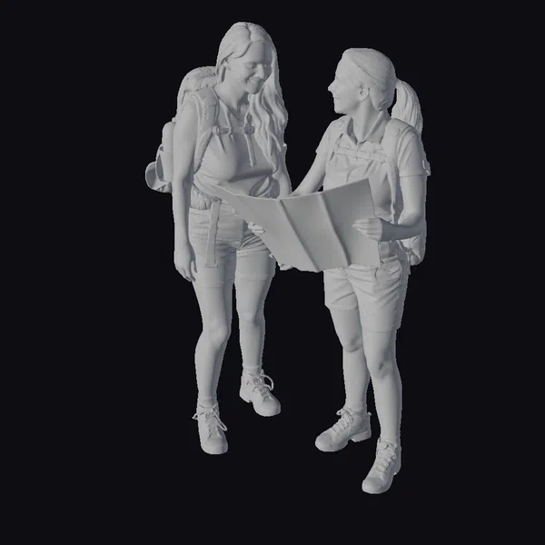 Rendered in a realistic style, this 3D model depicts two young women, both equipped with hiking boots, shorts, and backpacks, engaged in studying a topographic map. Their attire is detailed, with one wearing a red tank top and black shorts, the other in a blue polo shirt and light-colored shorts. The map they hold is creased and detailed, suggesting they are in the midst of planning their route or navigating through unfamiliar terrain. The model’s pose and expressions convey a sense of camaraderie and adventure, making it suitable for projects related to outdoor activities, travel, or friendship. The model’s high level of detail, from the texture of their clothing to the expressions on their faces, makes it ideal for high-quality projects such as animations, games, or virtual reality experiences.