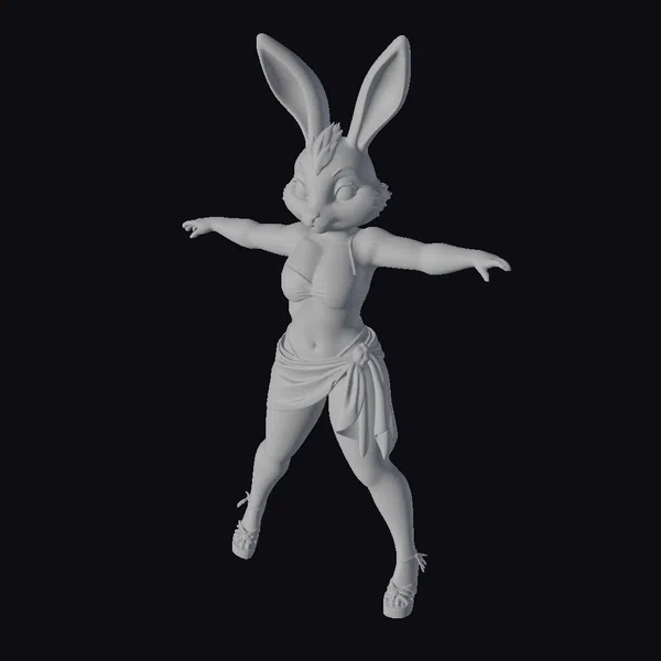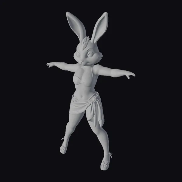 Detailed in every aspect, this stylized bunny dancer model boasts a holographic sheen on her skin, complemented by pink inner ears and vibrant blue eyes that sparkle with intrigue. Her outfit consists of a bra and a wrapped skirt, both showcasing a dazzling iridescent texture that shimmers with hues of green and purple. The model comes posed with arms outstretched and legs positioned in a lively stance, perfect for adding a touch of magic to games, animations, or virtual reality experiences. The intricate details, from the texture of her skin to the reflective quality of her clothing, make this model a standout choice for projects requiring a blend of fantasy and modern style. Whether for animation, game development, or print, this character model is designed to enchant.