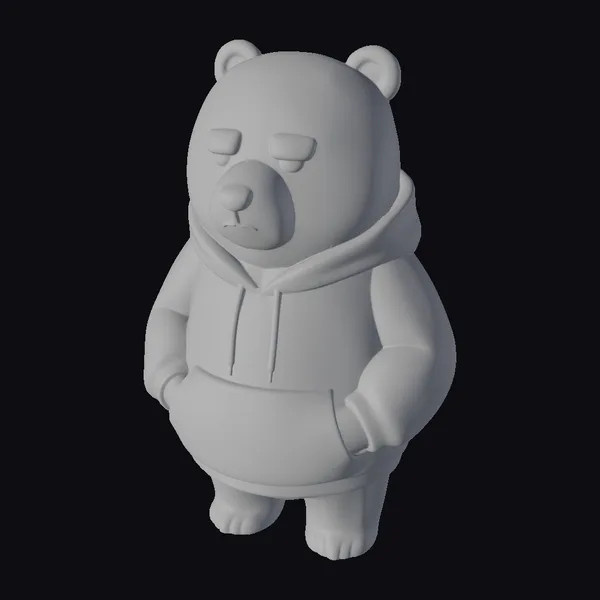 Standing with a slight slouch and arms crossed, this stylized bear exudes a comically annoyed demeanor. Its white fur is smooth and rounded, complemented by small, rounded ears and a black nose. The bear’s eyes are narrowed, adding to its grumpy expression. The vibrant yellow hoodie is a striking feature, with a large hood and oversized sleeves that add to the bear’s endearing appearance. The model is well-suited for use in animations, games, or as a quirky decorative piece. Its stylized features make it a versatile asset for various creative projects.
