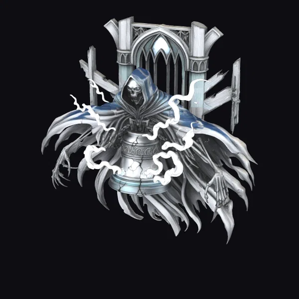 In a hauntingly beautiful pose, the hooded skeleton sits atop a intricately designed gothic throne, its skeletal face hidden beneath the hood of a tattered cloak. The cloak itself appears to be billowing with an ethereal smoke, adding a sense of mystique to the already foreboding scene. The throne, with its pointed arches and ornate details, seems to be a relic of a bygone era, while the shattered swords embedded in its back hint at a violent history. This 3D model would be perfect for adding a touch of dark fantasy to games, animations, or 3D prints. Its detailed textures and lighting make it suitable for high-quality renderings.