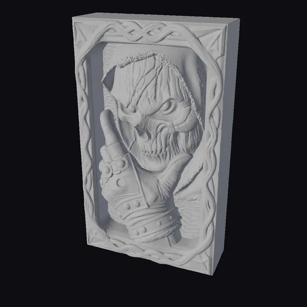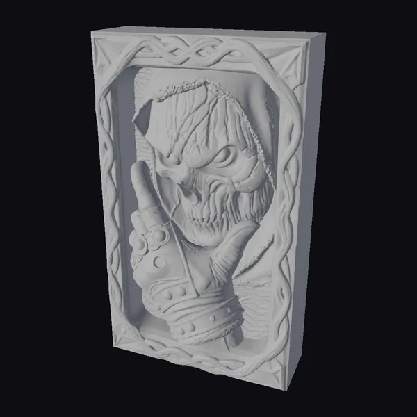 This intricately designed model showcases a hooded skeleton with a skull that boasts striking red and gold accents, set against a backdrop of a deep, reddish-brown wooden frame adorned with Celtic-inspired knotwork. The skeleton’s right hand, encased in a studded leather glove, is raised in a gesture that seems both commanding and mystical. The model’s stylized approach blends realistic and fantastical elements, making it a captivating piece for various applications, including games, animation, and design projects. Its unique blend of gothic and symbolic features can add depth and intrigue to any scene or project.