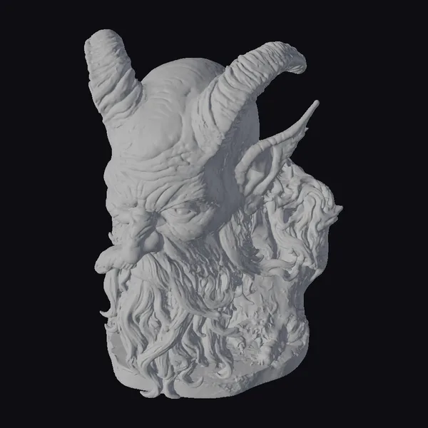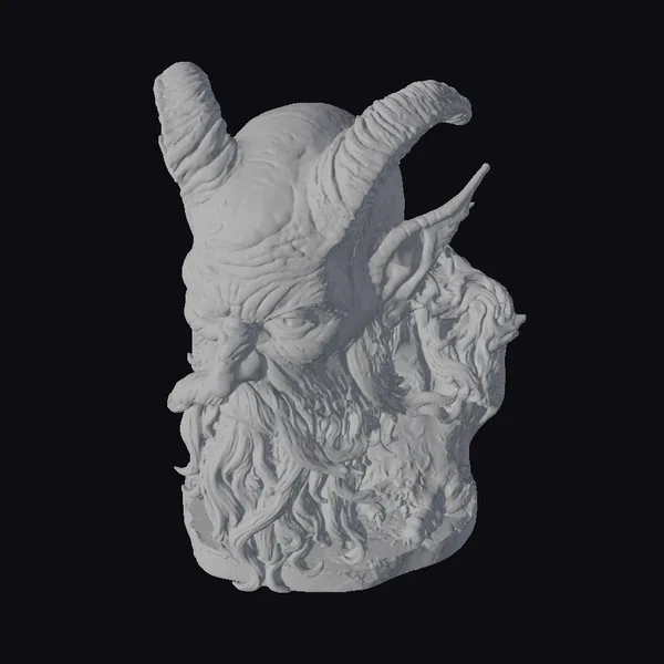 Intricately designed with a focus on texture and expression, this fantasy creature’s head features a pair of imposing horns that curve upwards, framing a face that exudes age and wisdom. The long, flowing beard and detailed wrinkles on the skin add to the character’s mystique, suggesting a being of great power and ancient lineage. The stone-like texture, rendered in shades of gray, gives the model a realistic, weathered appearance. Ideal for use in games, 3D printing, VR/AR experiences, animation, and design projects, this model brings a touch of fantasy and mystery to any creative endeavor.