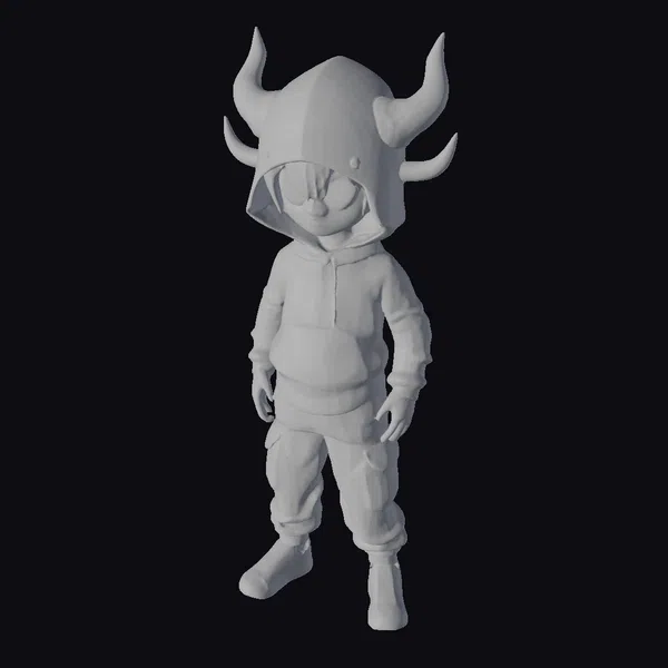 Standing confidently, this character figure is detailed with a unique blend of casual and intimidating features. The horned helmet, with its smooth, matte finish, sits atop a hoodie that drapes comfortably over the figure’s form. The eyes, aglow with a vibrant red light, are the focal point, drawing in with an otherworldly allure. The outfit, complete with cargo pants and sneakers, adds a grounded touch to the otherwise fantastical elements. This model is perfect for projects requiring a character that blends streetwear style with fantasy elements, suitable for games, animation, and print applications.