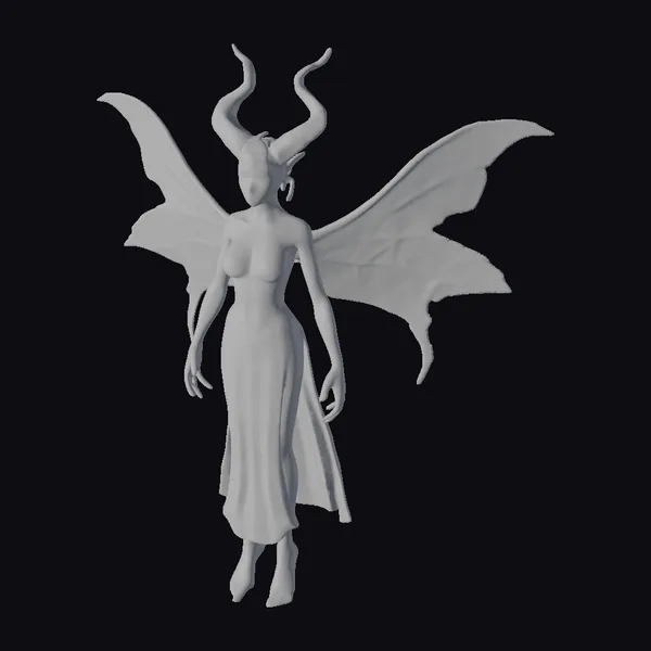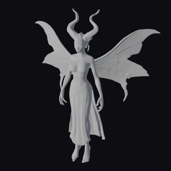 Standing tall with an air of elegance, this horned moth-fairy hybrid boasts wings that shimmer with nebula patterns in shades of purple, gold, and pink. Her body, a perfect blend of human and insect, gleams with a subtle sheen, accentuating her curves. The delicate, almost translucent wings spread wide, as if ready to take flight. Her face, a masterpiece of beauty, features a serene expression, framed by two majestic horns that curve upwards, adding to her mystical aura. This model is perfect for use in games, 3D printing, VR/AR experiences, animation, and design projects, offering a touch of magic and wonder.
