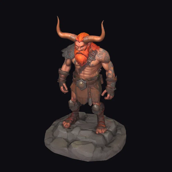 Standing proudly on a base of rough, gray stones, this horned tribal beast warrior exudes a fierce presence. His body is a masterpiece of comic-style art, with exaggerated features and vibrant colors. The warrior’s orange hair and beard are striking, complemented by the earthy tones of his leather-like attire and the darker hues of his metal accessories. Tattoos cover his arms, adding to his tribal appearance. The pose, with feet shoulder-width apart and arms relaxed by his sides, suggests readiness for battle. This 3D model is perfect for projects requiring a dynamic, fantasy creature, such as animations, games, or virtual reality experiences.