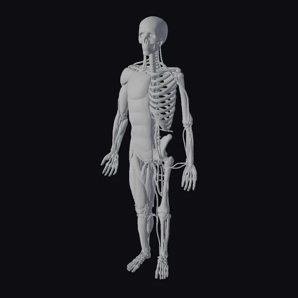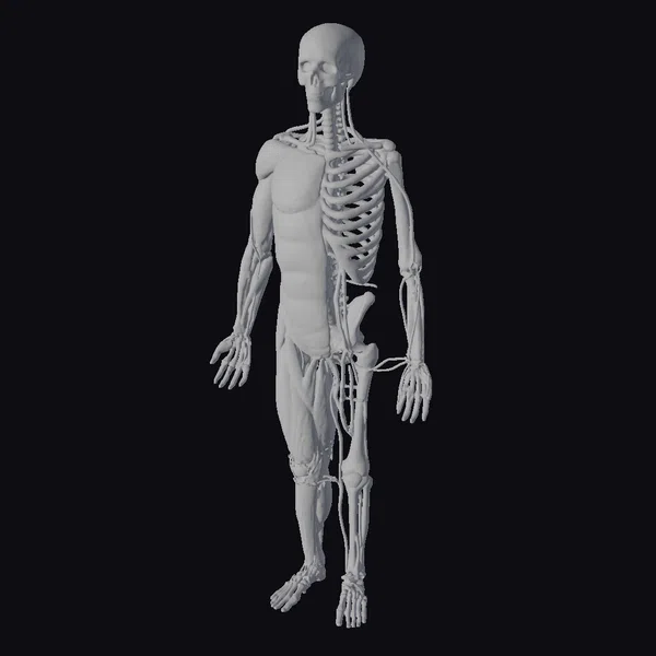 Standing with its arms relaxed by its sides, this 3D model of the human body offers a comprehensive view of its internal anatomy. The skeletal system, complete with a skull, ribcage, and vertebrae, is prominently displayed alongside a detailed muscular structure. The transparent skin allows for a clear view of the muscles, tendons, and bones, making it an invaluable resource for educational purposes, medical studies, or artistic reference. Its detailed and accurate representation makes it suitable for use in various fields such as game development, animation, virtual reality, and architectural visualization.