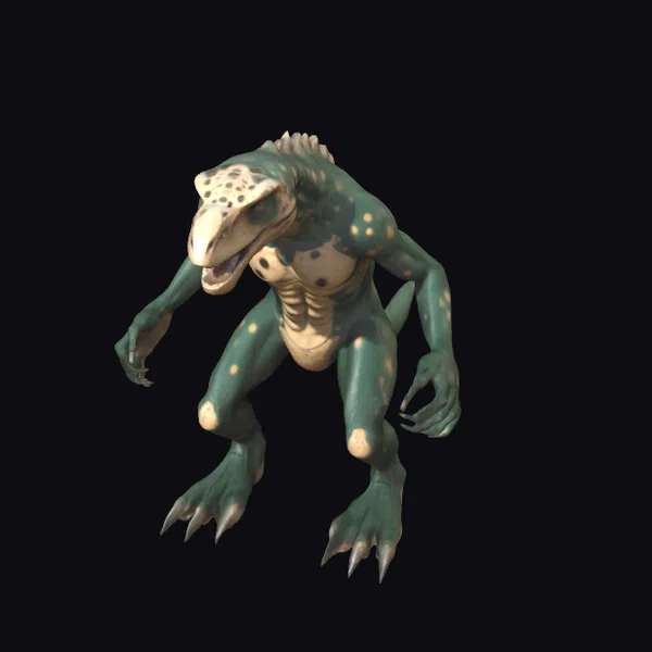 Detailed with precision, this humanoid raptor features a predominantly green body adorned with yellow spots, contrasting with its cream-colored face, chest, and abdomen. Its sharp, clawed hands are poised as if ready to pounce, while its mouth is open, revealing a glimpse of its inner fangs. The raptor’s posture, with legs bent and arms extended, captures a dynamic moment of tension and aggression. This model is perfect for projects requiring a mythical or fantasy creature, such as animations, games, or conceptual designs. Its detailed anatomy and realistic textures make it suitable for high-quality productions.