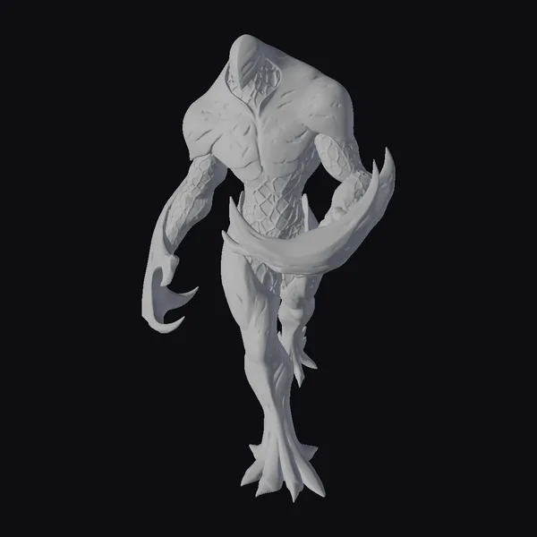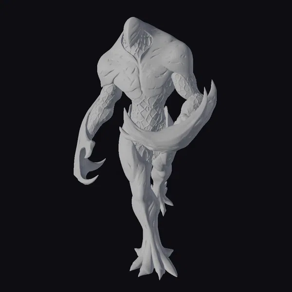 Standing imposingly, this humanoid creature is a vision of dark fantasy. Its body is covered in swirling patterns that resemble the void, with sharp, jagged armor plating that seems almost organic in nature. The creature’s face is obscured, adding to its enigmatic and terrifying presence. Long, curved claws extend from its hands, as if poised to strike. The overall effect is one of foreboding and menace, as if this creature is a guardian of some dark and ancient power. Its detailed texture and lighting make it a compelling addition to any dark fantasy scene, suitable for use in games, 3D printing, VR/AR experiences, animation, and design projects.