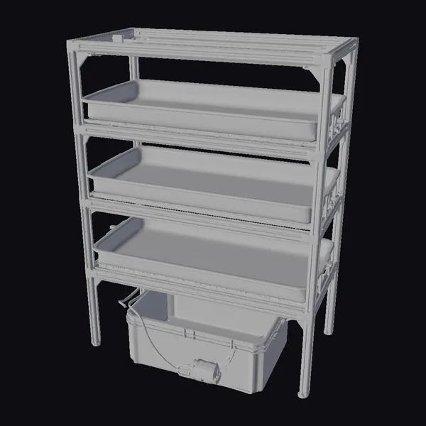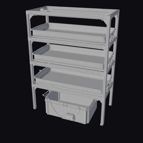 Positioned dynamically against a clean background, the hydroponic vertical garden unit showcases its sturdy metallic frame and multiple tiers of plant shelves. Each shelf is equipped with purple LED lights, highlighting its advanced hydroponic system designed for efficient plant growth. The lower section houses a collection bin, emphasizing its self-contained functionality. This 3D model excels in detailed textures, from the metallic sheen of the frame to the subtle glow of the LED lights. Ideal for projects focused on sustainable living, urban farming, or innovative agricultural technology, this model can enhance scenes in animations, games, or architectural visualisations.