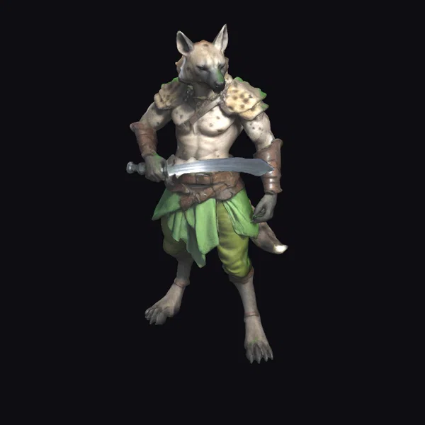 Standing with a powerful stance, this digitigrade hyena soldier boasts a detailed, spotted fur texture and a menacing expression. Its upper body is protected by a combination of leather and iron armor, including a chestplate and shoulder guards, while its lower body is covered in tight, green pants. The warrior’s sharp claws and teeth add to its ferocious appearance. The model is highly detailed, with realistic lighting and shading that accentuates its muscular physique. Ideal for use in games, animation, and design projects, this model brings a touch of fantasy and adventure to any scene.