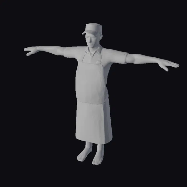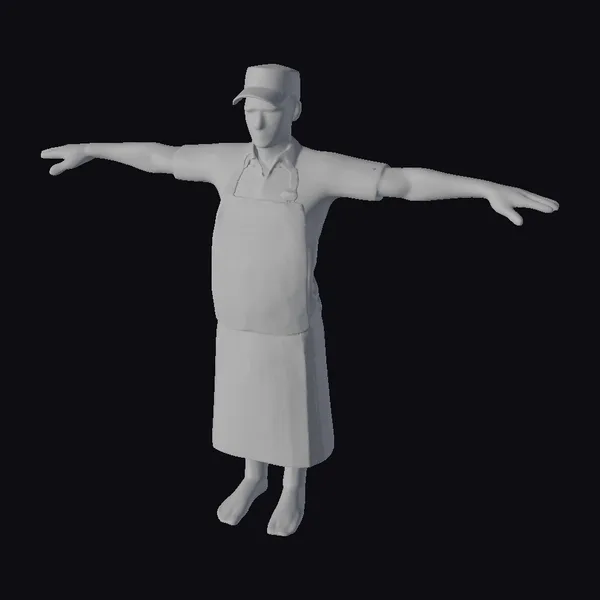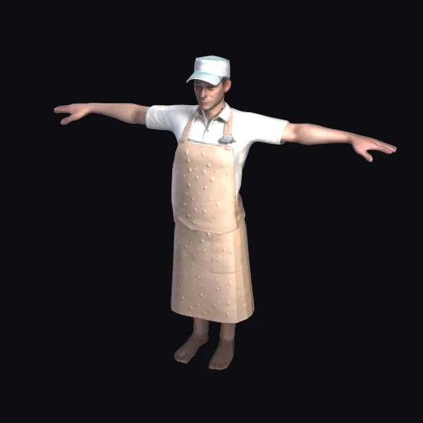 Detailed from head to toe, this 3D model of an ice cream shop employee showcases a natural body with a slight belly, wearing a white short-sleeved shirt tucked into a beige apron adorned with small pockets. A pen rests on his chest, suggesting he’s always ready to take orders. His facial features are delicately modeled with subtle expressions, and his feet are clad in dark brown shoes. The T-pose allows for easy rigging and posing, making it versatile for various applications such as game development, animation, 3D printing, or architectural visualization. The model’s realistic style ensures a lifelike appearance, perfect for projects requiring a human element.