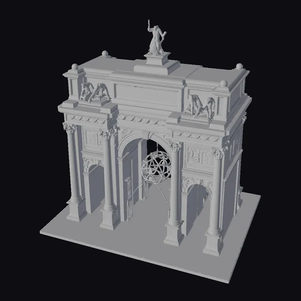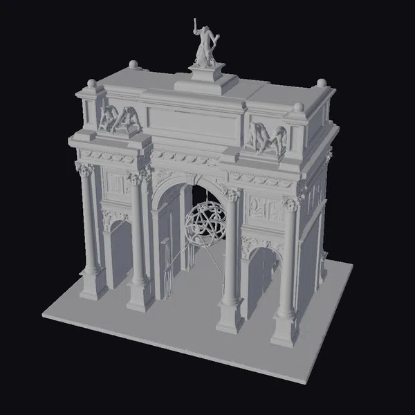 Positioned dynamically on a sleek black base, the arch’s detailed facade is accentuated by warm lighting that casts a festive glow on its surroundings. The structure boasts a central archway flanked by columns, with a statue standing proudly atop, adding to its grandeur. Ornate details and a spherical decorative element within the archway enhance its visual appeal. This model is perfect for projects requiring a touch of historical and celebratory essence, such as animations, games, or architectural visualizations.
