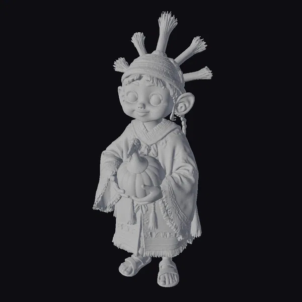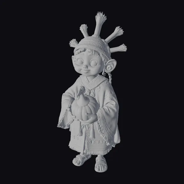 Standing with a gentle posture, this endearing Inca character holds a pumpkin with both hands, showcasing intricate details such as the textures of the traditional clothing and the feathers on the headdress. The stylized, low-poly art style gives the model a contemporary feel, while the large eyes and cheerful expression evoke a sense of friendliness. The pumpkin, adorned with a slice removed, adds a seasonal touch, perfect for Thanksgiving-themed projects. This model is ideal for use in animations, games, VR/AR experiences, and 3D printing, offering a unique blend of cultural inspiration and modern design.