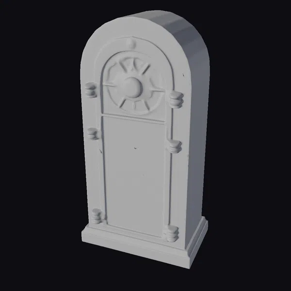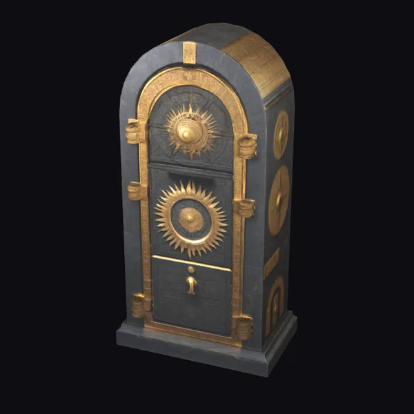 Crafted with meticulous attention to detail, this stylized safe boasts an arched top and a body made from dark stone, evoking the grandeur of Inca architecture. The door is embellished with two prominent sunburst designs, one larger than the other, both rendered in golden hues that catch the light. The safe’s surface is a tapestry of textures, from the smooth stone to the raised, ornate patterns that add a layer of depth and intrigue. The golden accents not only add a touch of luxury but also serve to highlight the craftsmanship that has gone into creating this piece. Whether for storing valuable items or as a statement piece, this safe is sure to draw admiring glances. Its applications are vast, ranging from games and animations to architectural designs and interior decorating concepts.