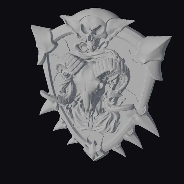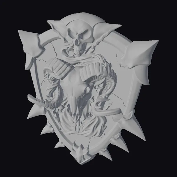 The Infernal Ram Shield boasts a detailed ram’s skull at its core, surrounded by swirling orange flames that appear to dance across its surface. The shield itself is a masterpiece of dark fantasy design, featuring a metallic finish with a weathered, battle-worn appearance. A skull-like visage crowns the shield, adding an air of ominous foreboding. Jagged spikes protrude from the shield’s edges, further emphasizing its formidable nature. This 3D model is perfect for use in games, 3D printing, VR/AR experiences, animation, and design projects where a touch of dark fantasy is required. Its intricate details and realistic textures make it an excellent choice for creators seeking to add depth and authenticity to their work.