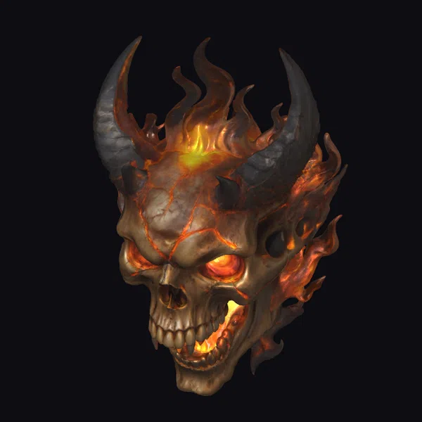 This intricately detailed demonic skull features a complex network of cracks and fissures, with glowing red eyes that seem to burn from within. The skull’s surface is a mottled mix of dark, charred bone and smoldering embers, with flames licking at its edges. Two curved horns protrude from the top of the skull, adding to its menacing appearance. The overall effect is one of dark, malevolent power. Ideal for use in games, animation, or 3D printing, this model is sure to add a touch of infernal drama to any project.