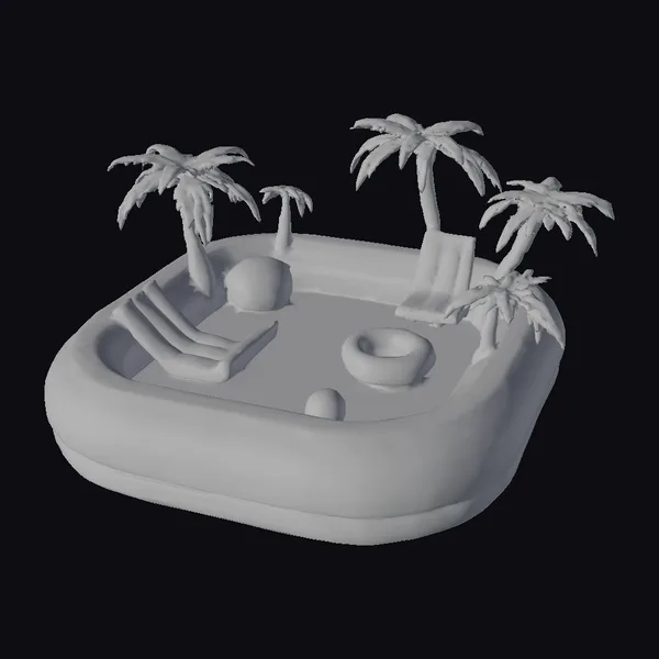 Detailed with precision, this inflatable pool scene boasts a bright blue pool surrounded by lush green grass and adorned with cartoon-style palm trees. Two orange sun loungers and a variety of beach balls add to the festive atmosphere. The pool’s edge features playful fish and other sea creatures, enhancing its appeal. Textures are smooth and inviting, with lighting that accentuates the vibrant colors. Ideal for use in games, animations, or as a design element, this model brings a splash of fun to any project.