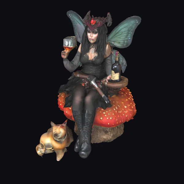 This intricate model showcases a mythical intoxicated fairy queen in a pose of relaxed indulgence, seated on a large, red-capped mushroom adorned with white spots. She wears a dark, elaborate dress and headpiece, complete with a red gemstone and butterfly-like wings spread wide. A flintlock pistol rests across her lap, while a wine glass and bottle accompany her on a small table beside her. The fairy queen’s expression is one of playful intoxication, complemented by a golden cat figurine at her feet. The model’s level of detail, from the textures of her dress and the mushroom to the metallic sheen of the pistol, makes it suitable for various applications including games, 3D printing, VR/AR experiences, and animation. The unique blend of fantasy and historical elements, like the flintlock pistol, adds depth and intrigue.