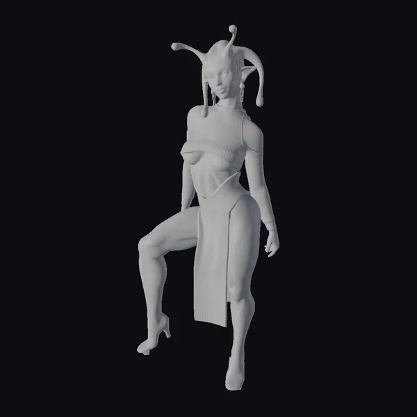 Detailed visual breakdown reveals a pose that exudes confidence, with one leg bent in a dynamic stance. The textures of her skin shimmer with an iridescent sheen, reflecting hues of green, pink, and blue. Her eyes glow with an ethereal light, while her headpiece features teardrop-like protrusions that seem to be dripping with a glowing substance. The black outfit is meticulously designed, with a high neckline and long sleeves that contrast with the revealing cut-out sections. Proportions are well-balanced, with attention to detail in the facial features and hands. This model is perfect for projects requiring a unique, otherworldly character, such as games, animations, or VR/AR experiences.