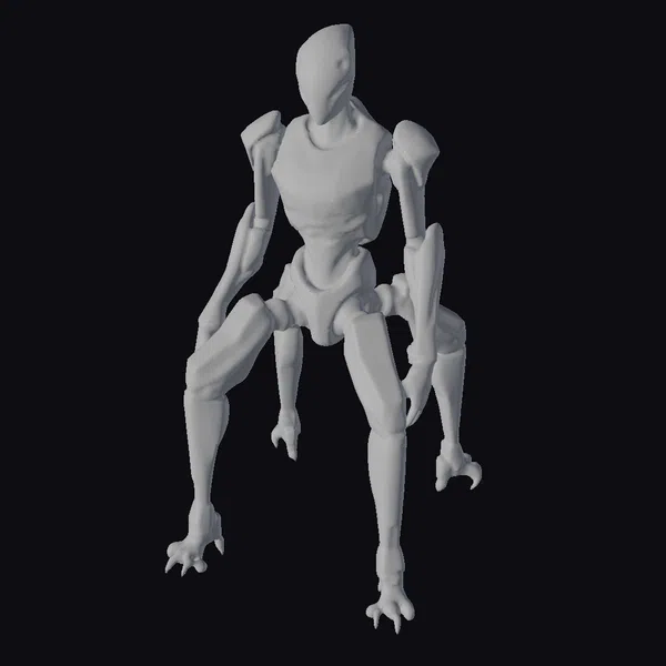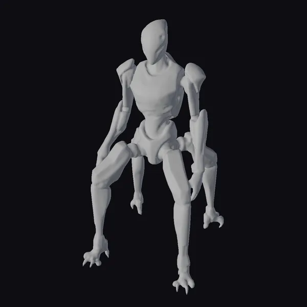 Perched on four agile limbs, this robot’s body is a masterclass in futuristic design. The iridescent alloy plating shimmers with a soft, ethereal glow, casting a mesmerizing light on the surrounding environment. The sleek, angular frame is accentuated by sharp, metallic edges, while the hexagonal plating on its body pulses with a gentle, blue-green light. As a 3D model, this robot is perfect for use in sci-fi games, animations, or architectural visualizations, where its futuristic design and glowing accents can add a touch of high-tech sophistication. Its pose, with legs splayed wide and arms hanging loose, conveys a sense of relaxed vigilance, as if standing guard over a futuristic cityscape.