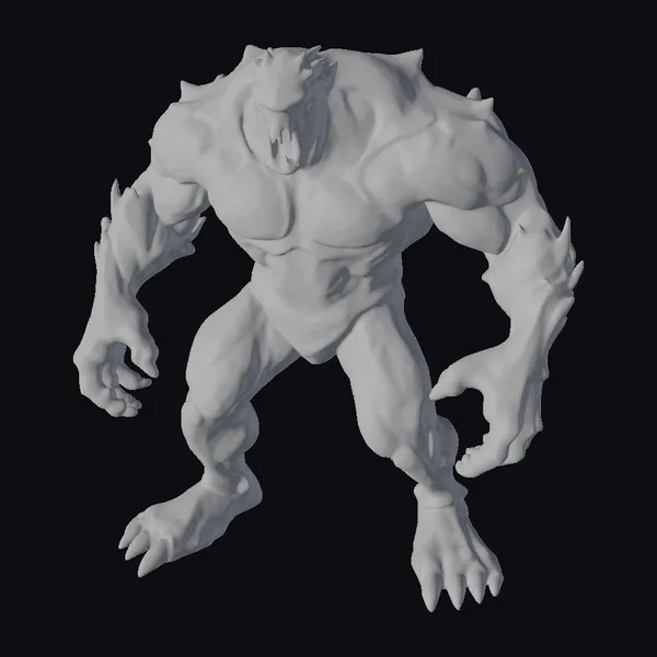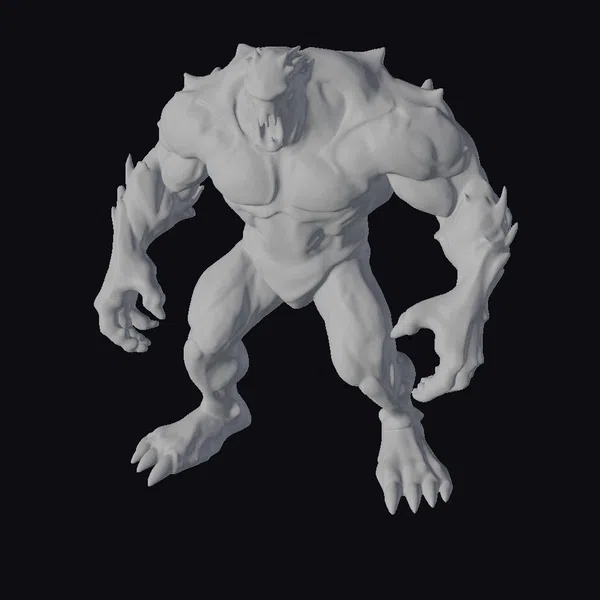 Standing tall with its legs shoulder-width apart, this fantastical creature exudes an intimidating presence. Its gray skin is adorned with iridescent patches that reflect a kaleidoscope of colors, from purple and blue to green and gold. The creature’s physique is characterized by well-defined muscles, particularly in its chest and arms, which are accentuated by sharp, spiky protrusions. Its hands are tipped with long, white claws, ready to strike. The creature’s face is a snarling visage with sharp teeth, adding to its fearsome demeanor. This model is perfect for use in games, 3D printing, VR/AR experiences, animation projects, or design concepts where a mythical creature is needed.