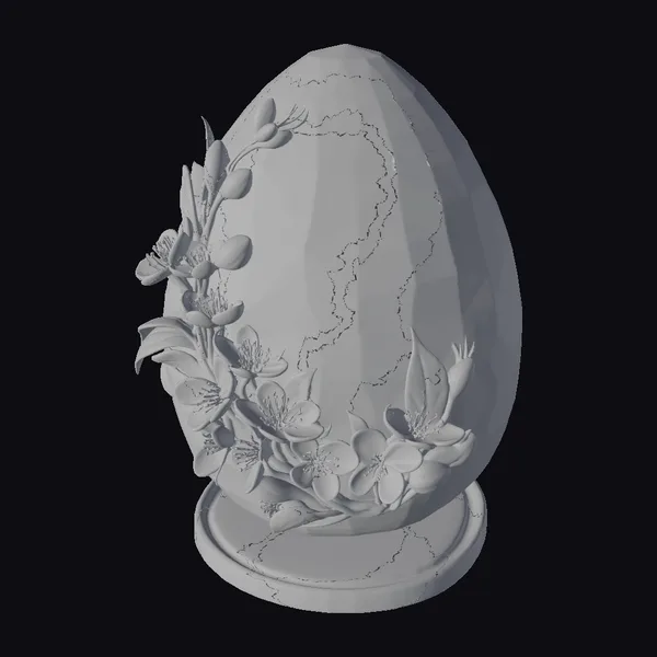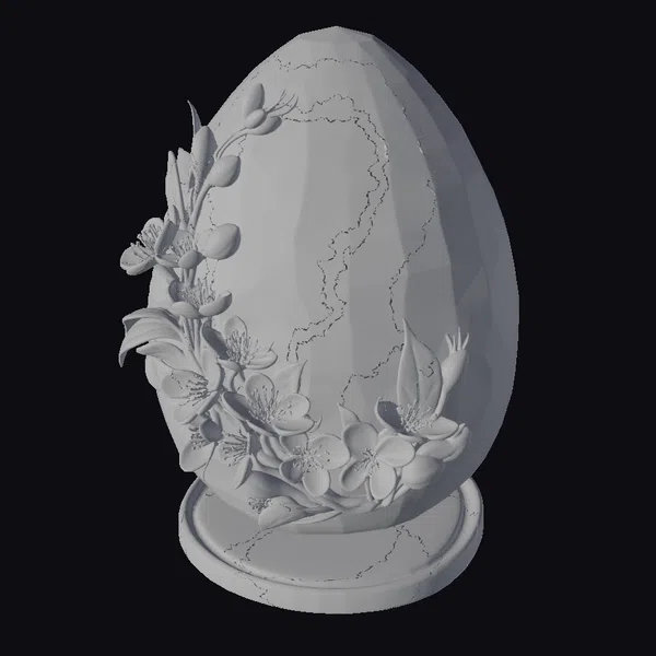 Perched elegantly on a transparent stand, this meticulously crafted Easter egg dazzles with its iridescent surface that gradates through a mesmerizing palette of green, blue, and purple hues. Delicate white flowers with golden centers and soft pink buds intertwine with vibrant green leaves, spiraling around the egg in a beautiful floral motif. The egg’s surface texture subtly suggests the delicate patterns often found on fine porcelain. As light catches the egg, its shimmering colors seem to shift and change, inviting the viewer to appreciate the intricate details and craftsmanship. This stunning piece is perfect for enhancing Easter or spring-themed projects, games, animations, or 3D environments, adding a touch of elegance and festive charm.