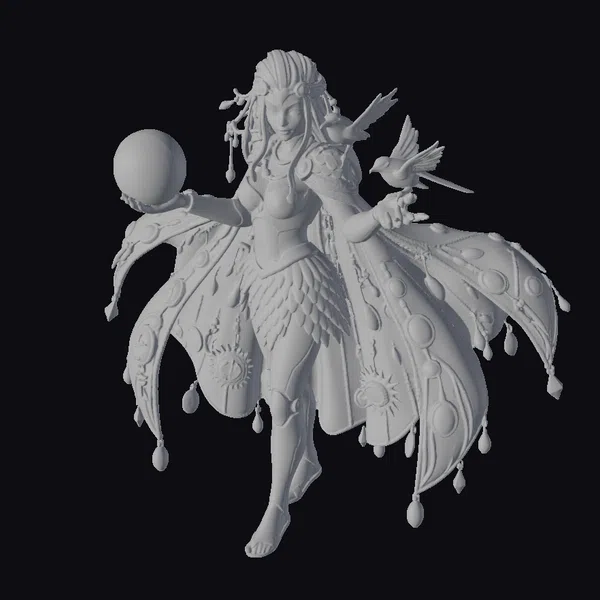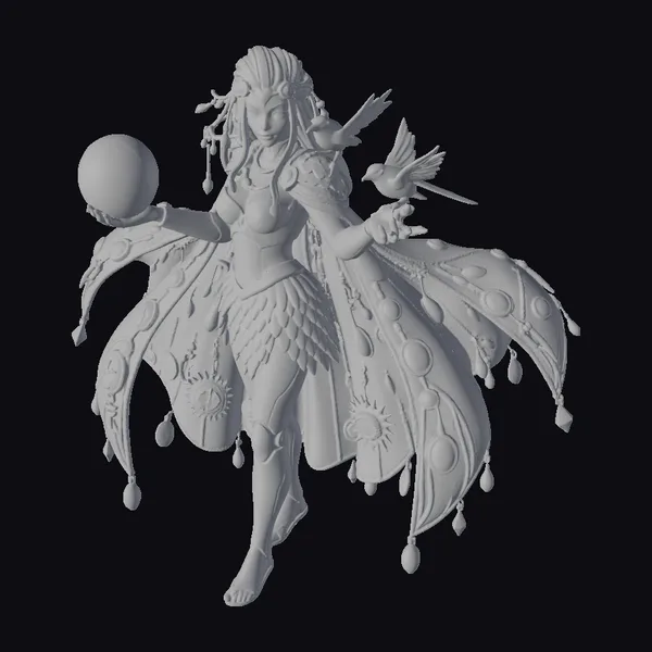 Standing tall with an air of serenity, the iridescent fantasy goddess showcases intricate details in her ornate jewelry and flowing attire. Her iridescent orb glows with a swirling purple and blue light, while two birds – one black and white, the other golden – seem to dance around her. The goddess’s long, flowing hair and majestic cape, adorned with gemstones and gold accents, create a sense of movement and fluidity. Her golden eyes gleam with an otherworldly intensity. This 3D model would be perfect for use in fantasy games, animations, or virtual reality experiences, transporting viewers to a realm of magic and wonder.