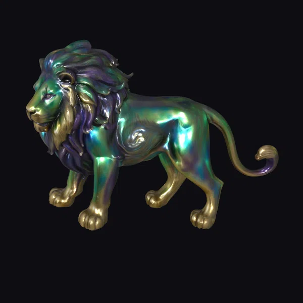 Positioned in a powerful stance, the lion’s body is rendered in a mesmerizing array of colors, with swirling patterns of iridescence that seem to shift and shimmer in the light. The mane, with its flowing strands, appears almost liquid in its texture, while the eyes gleam with a subtle intensity. This stylized representation of a lion is perfect for projects requiring a touch of fantasy and magic, such as animations, games, or architectural visualizations. Its unique aesthetic can add a captivating element to any scene, from fantasy landscapes to modern interiors.