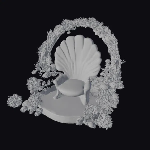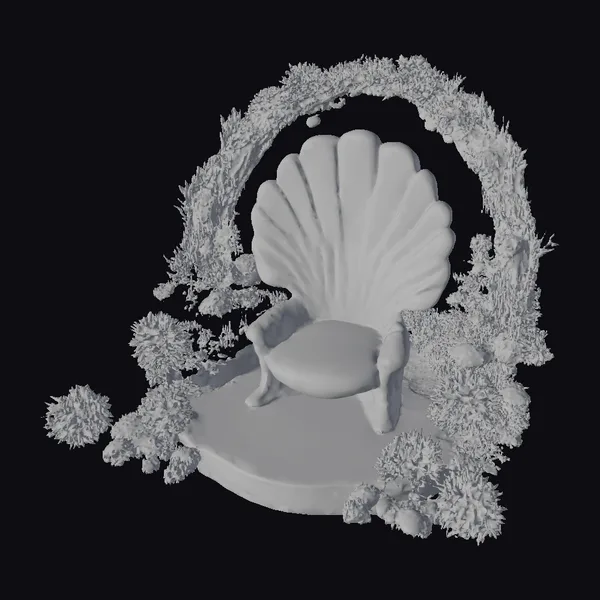 In a majestic pose, the iridescent shell throne commands attention, its intricately detailed shell back glistening with a mesmerizing iridescence that shifts colors in the light. The pearlescent seat and arms appear almost liquid, as if molded from the finest mother-of-pearl. Surrounded by a tangle of coral and anemones, the throne seems to have grown organically from the ocean floor. The coral arch framing the throne is covered in tiny, glowing polyps that add a soft, pulsing light to the scene. This stunning 3D model is perfect for use in games, animation, VR/AR experiences, or 3D printing, offering a unique and eye-catching centerpiece for any underwater or fantasy environment.