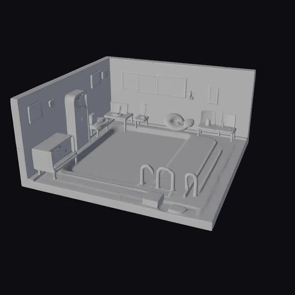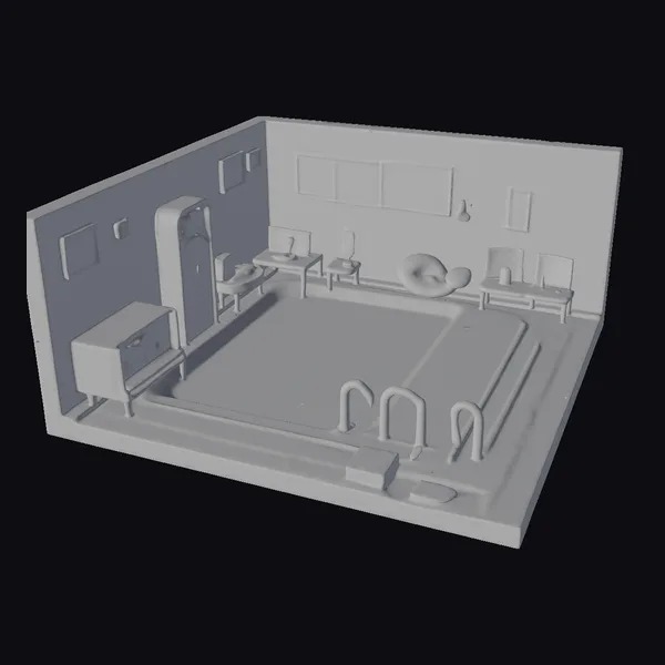 Dive into the details of this meticulously crafted isometric swimming pool scene, where a turquoise pool takes center stage, surrounded by a wardrobe, dress hanger, and other furniture pieces. The room’s interior boasts a lively color palette, with pink towels hanging on the wall, a potted plant adding a touch of greenery, and a bicycle leaning against the wall. The scene is illuminated by soft lighting, creating a warm and inviting atmosphere. This 3D model is perfect for projects requiring a unique, cartoon-style setting, such as animations, games, or architectural visualizations.