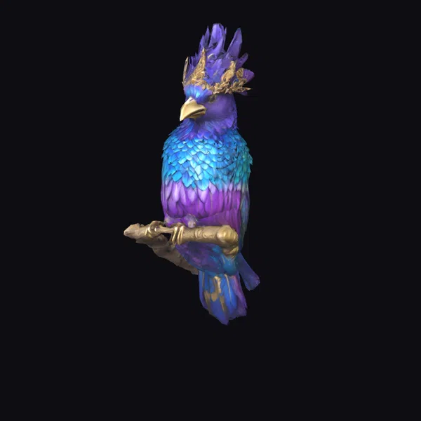 This stunning, jewel-toned bird is meticulously posed on a golden branch, its body a mesmerizing blend of blue and purple feathers that seem to shimmer in the light. The bird’s head is adorned with an elaborate, gold-accented crest, adding to its regal demeanor. The level of detail is exceptional, with each feather meticulously textured and colored to create a truly lifelike appearance. The golden branch, with its intricate carvings, provides a sturdy perch for this majestic creature. Ideal for use in games, animation, or 3D printing, this model is sure to add a touch of fantasy and elegance to any project.