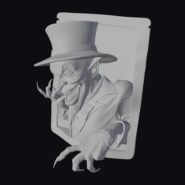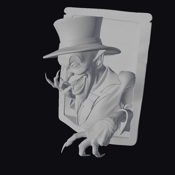 Detailed visual breakdown reveals the Joker’s pose, showcasing his sharp, pointed fingernails and a wide, toothy grin. His face paint is stark white, complemented by a distinctive black mustache-like design around his eyes. The texture of his top hat and the intricate details of the playing card behind him add depth to the model. The lighting highlights the Joker’s menacing expression and the shiny surface of his hat. This model is perfect for use in games, 3D printing, VR/AR experiences, animation, and design projects, offering a unique and captivating character to enhance any creative endeavor.