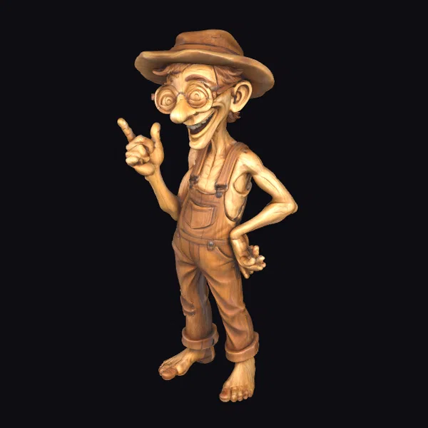 Detailed with a warm, wooden texture, this jolly farmer model exudes a playful vibe, from his spirited gesture to his wide, welcoming smile. His rustic attire, consisting of a hat and overalls, is meticulously designed, with every fold and crease telling a story of its own. The barefoot stance and casual posture enhance his down-to-earth, approachable persona. This model is perfect for projects requiring a touch of rural charm or comic relief, suitable for animation, game development, or as a unique decorative piece. Its cartoonish style allows for versatile applications, from educational materials to entertainment content.