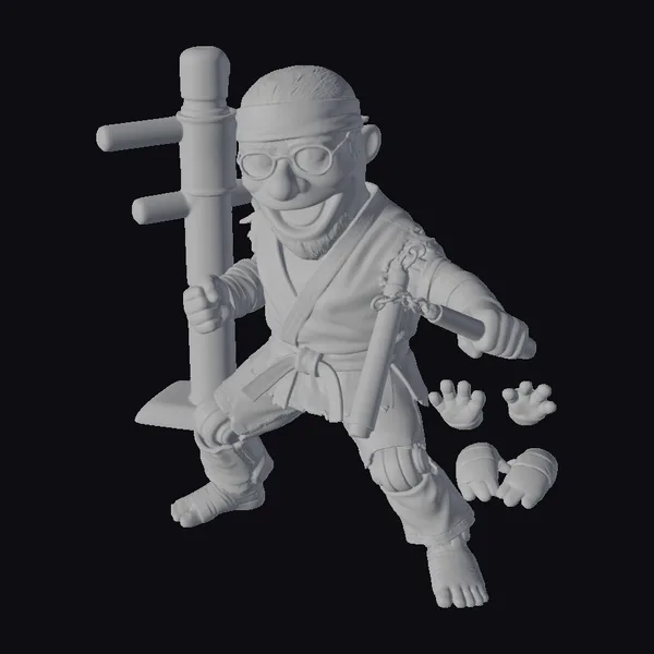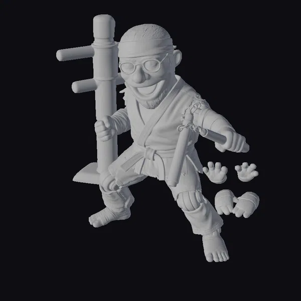 This stylized karate puppet figurine stands out with its vibrant, cartoonish appearance. The character’s bald head, thick-rimmed glasses, and wide grin convey a sense of excitement and friendliness. The white karate gi with a black belt and the black headband featuring a Japanese character add to the martial arts theme. The puppet comes with a pair of nunchucks and three additional black hand pieces, suggesting a range of action possibilities. The figurine’s pose, with one leg bent and fists clenched, captures a moment of dynamic movement. This model is perfect for animation, games, or as a quirky decorative piece. Its detailed design and comical style make it an engaging addition to various projects.