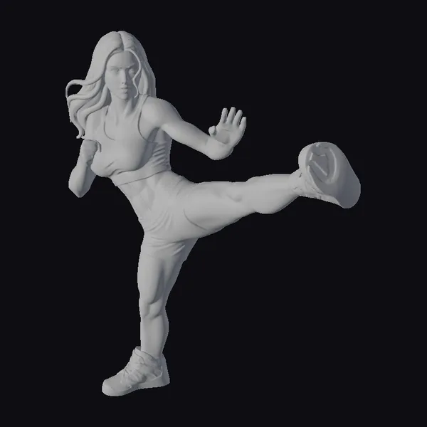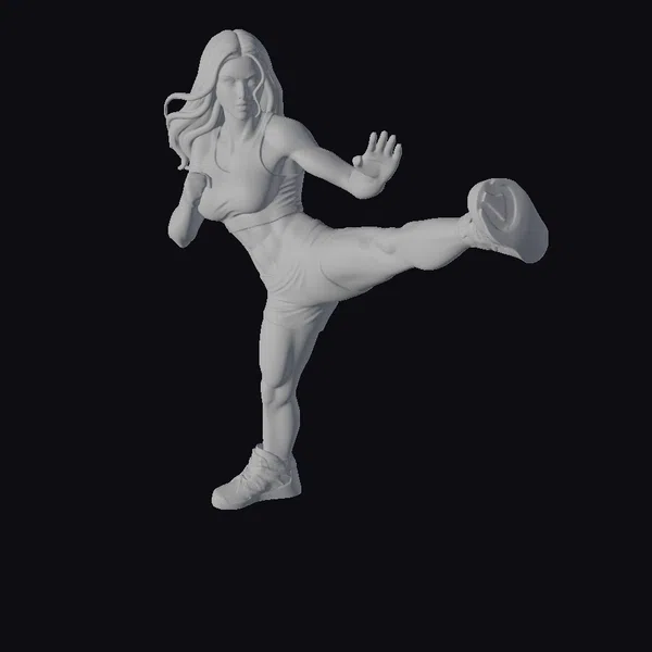 Detailed with precision, this stylized 3D model captures a woman in a powerful karate stance, her long brown hair flowing behind her. She wears a blue sports bra and shorts, complemented by black and white sneakers. Her muscles are defined, emphasizing her athletic build. The model’s pose, with one leg kicked out to the side and arms positioned for balance, conveys a sense of motion and readiness. Ideal for projects requiring a strong, active female character, such as animations, games, or fitness-related designs.