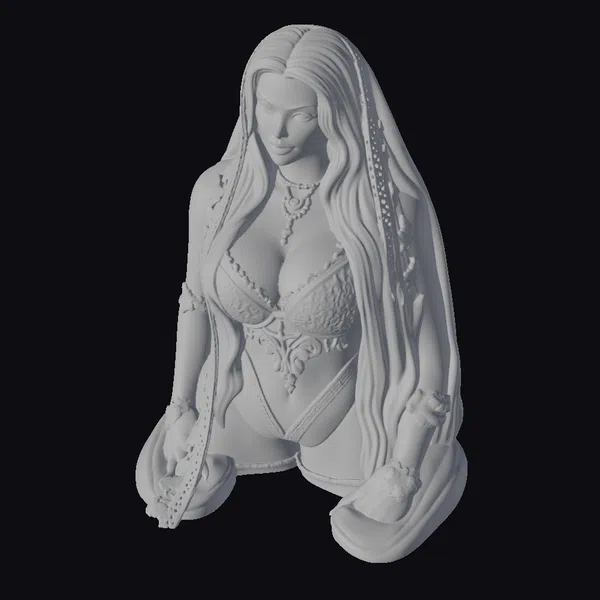 The kneeling woman exudes an aura of mystique, her pose accentuating the intricate details of her white and black ensemble, complete with lace and embroidery that tells a story of its own. Her long, dark hair flows like silk, complemented by a veil that drapes elegantly over her shoulders, adorned with blue floral motifs that add a touch of whimsy. The jewelry, a blend of silver and possibly gemstones, catches the light, adding to her allure. This model is perfect for projects requiring a blend of sensuality and elegance, suitable for games, 3D printing, VR/AR experiences, animation, and design projects.