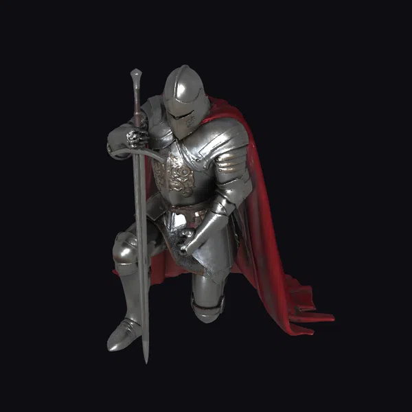 Rendered in exquisite detail, the knight’s armor glistens with a metallic sheen, adorned with intricate designs on the chest plate. His red cape flows dynamically behind him, caught in the motion of his kneeling pose. The knight’s helmet, complete with a visor, adds to his imposing appearance. He grasps the hilt of his long sword, its blade gleaming sharply. This model is perfect for use in historical dramas, fantasy settings, or as a striking decorative piece. Its realistic style makes it suitable for high-end animations, games, or 3D printing.