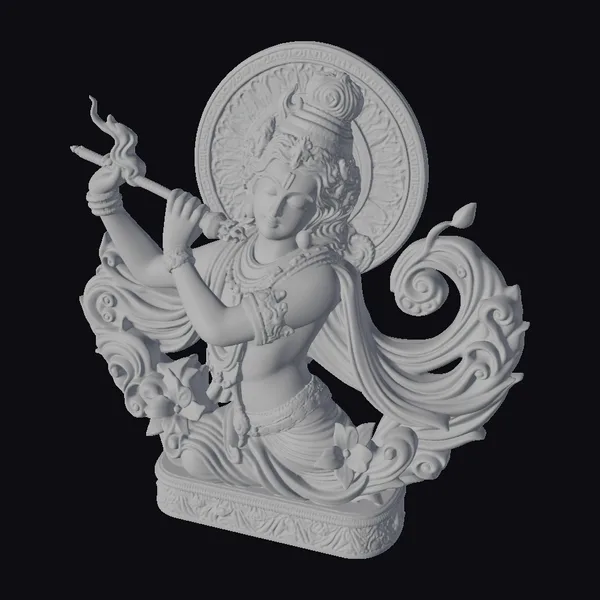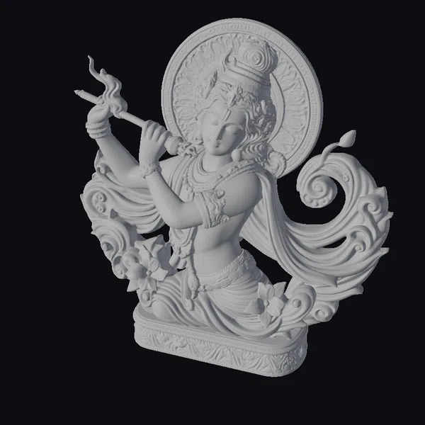 Rendered in exquisite detail, Krishna sits poised on a decorative base, his flute raised to his lips as if caught in a timeless moment of music. The statue’s golden hue shines with a soft, warm light, highlighting the delicate textures of his clothing and the ornate patterns that dance around him. A majestic halo encircles his head, adding to the sense of reverence and awe. This beautiful model is ideal for use in games, animations, or 3D prints, offering a captivating visual element that invites the viewer to step into a world of myth and legend.