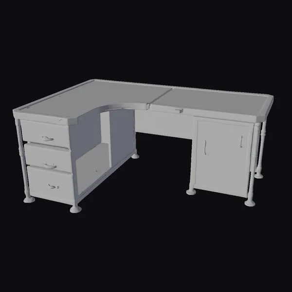 Positioned in a dramatic, slightly angled pose, this L-shaped security office desk exudes a sense of foreboding. The metallic surface, painted a dark gray, shows significant wear and tear, with rusty edges and a scratched finish that suggests years of heavy use in a high-stress environment. The desk features three drawers on one side, each adorned with simple, functional handles, and a closed cabinet on the other, hinting at the storage of sensitive materials. The legs, thin and sturdy, end in small, round feet that elevate the desk slightly off the ground. The overall design leans into an industrial aesthetic, perfect for settings that demand a utilitarian yet ominous presence. Ideal for use in horror-themed games, virtual reality experiences, 3D animations, or architectural designs aiming to evoke a sense of unease.