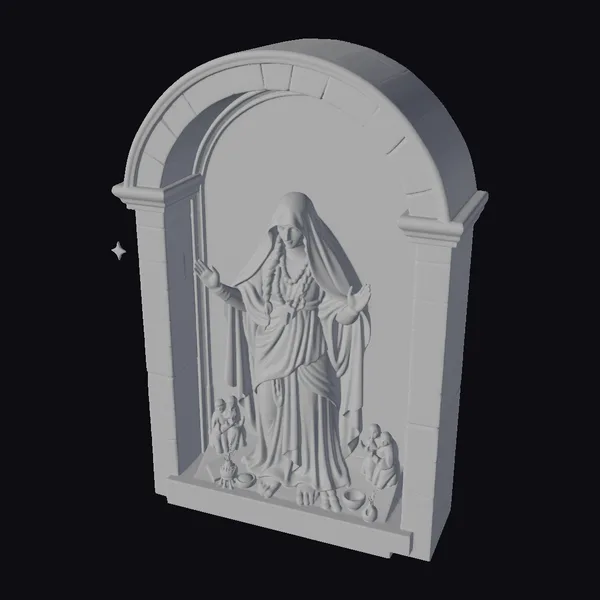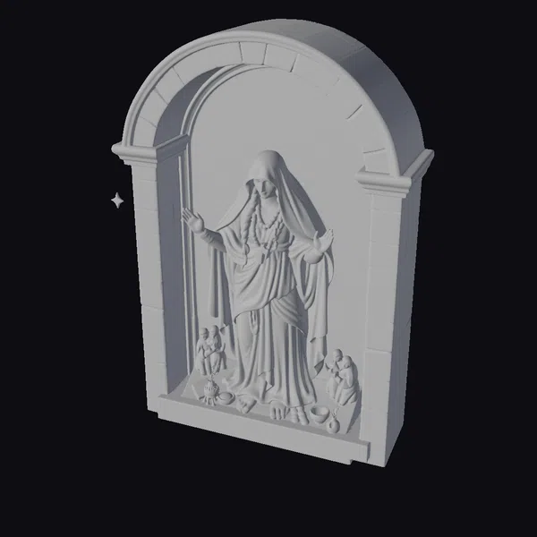 Positioned within a majestic stone archway, the Lady of the Golden Arch statue exudes an aura of peace and spirituality. Her long, dark hair is elegantly covered by a white veil, complementing her serene facial expression. The statue’s golden accents and the Latin inscriptions on the archway and base enhance its sacred ambiance. The detailed rendering of the stone structure, complete with a golden door and radiant halo, showcases exceptional craftsmanship. This model is perfect for use in religious simulations, historical reconstructions, or as a detailed architectural element in games, animations, and VR/AR experiences.