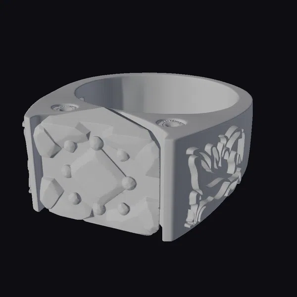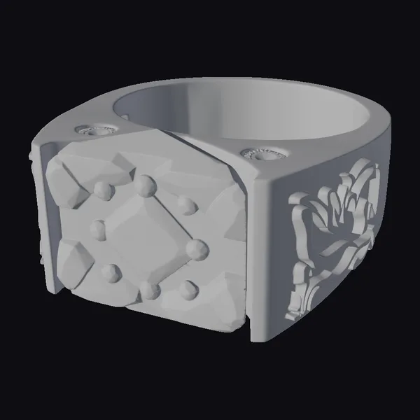 This large gold ring mold showcases a meticulously designed piece of jewelry making art. The mold’s surface is predominantly gold, with a smooth, shiny finish that catches the light. On one side, an intricate pattern is embossed, adding an element of sophistication and elegance. The mold’s design suggests it could be used for creating large, statement rings, possibly for special occasions or as luxury gifts. The detailed texture and the mold’s structure imply a high-quality, professional-grade product. Its applications could range from jewelry making and design to use in advertising, animation, or even virtual reality experiences.
