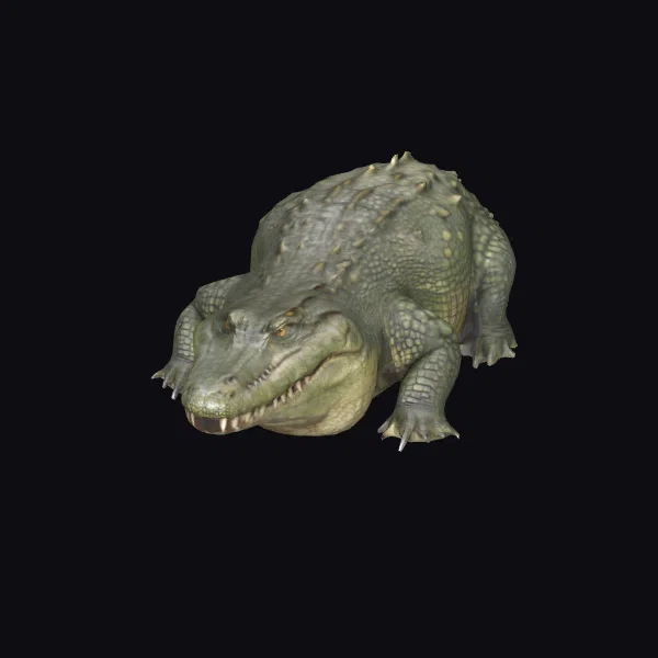 In a low, menacing stance, this crocodile 3D model appears ready to pounce. The texture of its skin is meticulously detailed, with intricate scales that reflect light and give the impression of dampness. The model’s pose showcases its muscular build, with powerful limbs and sharp claws. The crocodile’s mouth is open, revealing rows of razor-sharp teeth, adding to the overall sense of danger. This model would be perfect for use in wildlife documentaries, games, or any project requiring a realistic and intimidating reptile. Its high level of detail makes it suitable for close-up shots or animations.