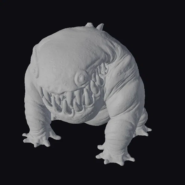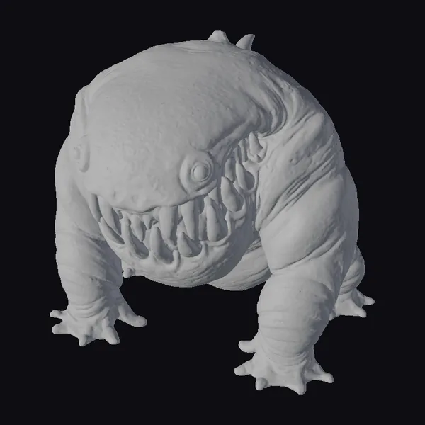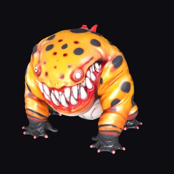 Perched on all fours, this laughing lizard creature exudes an aura of unpredictability, its body a mesmerizing blend of yellow and black hues. The creature’s head is a masterpiece of stylized design, with bulging eyes and a wide, toothy grin that seems to leap off the screen. The sharp, white teeth are accentuated by red gums, adding a pop of color to the overall design. The texture of the skin appears smooth, with subtle shading that gives the creature a sense of depth and dimensionality. This 3D model would be perfect for animators, game developers, or designers looking to add a touch of fantasy and humor to their projects.