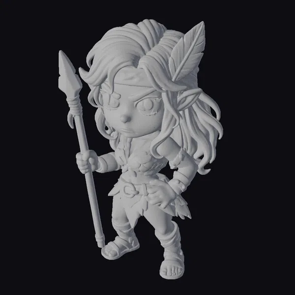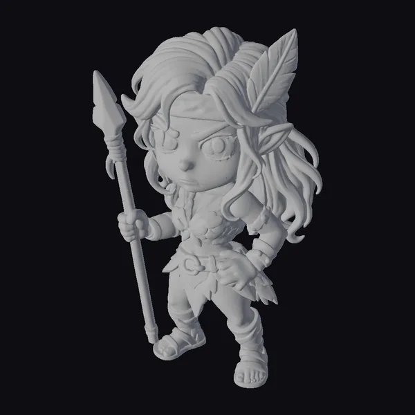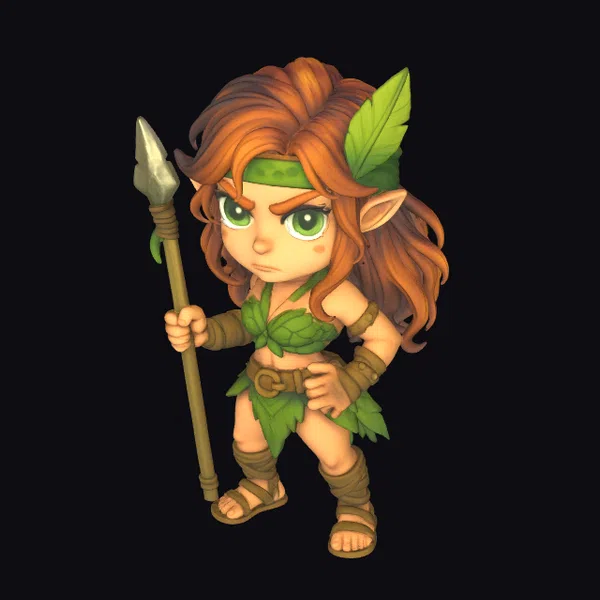 This chibi-style elf girl stands confidently, her green eyes gleaming with a fierce determination. Her long, flowing orange hair is adorned with leaves, and her outfit consists of a leafy green top and skirt, paired with brown leather-like accessories. The spear she holds is sturdy and strong, suggesting she’s prepared for battle. The intricate details, from the texture of her hair to the expression on her face, make this model a captivating addition to any fantasy or adventure-themed project. Ideal for use in games, animations, or as a unique design element, this model is sure to bring a touch of magic to your work.