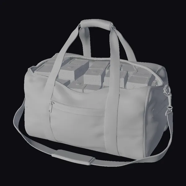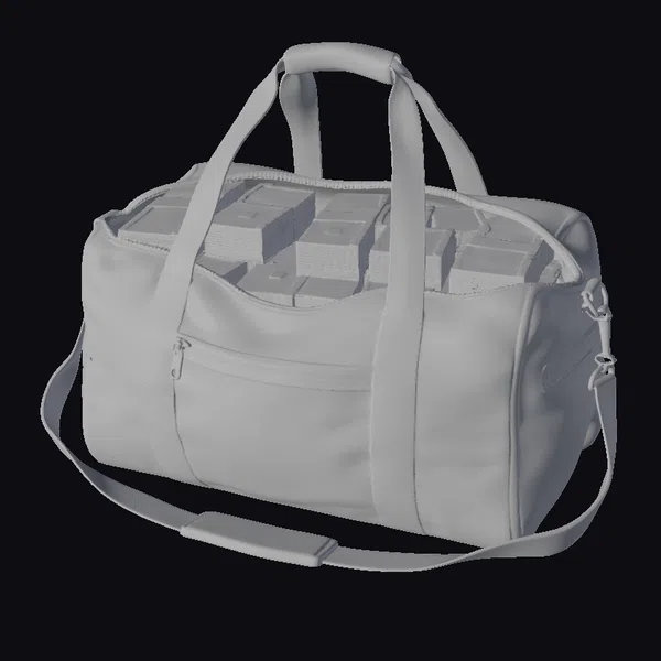 Positioned centrally with its long straps stretched out to the sides, the black leather bag appears robust, its material showing subtle signs of texture and wear. The bag’s main compartment is overflowing with tightly packed stacks of banknotes, each stack wrapped in paper and secured with a band. The cash is visibly detailed with repeating patterns of numerals and security threads, adding to the realism. The mood is one of clandestine wealth transfer or perhaps a hasty getaway. This model is perfect for scenes requiring a symbol of wealth, corruption, or urgency, suitable for use in games, animations, VR/AR experiences, and design projects.