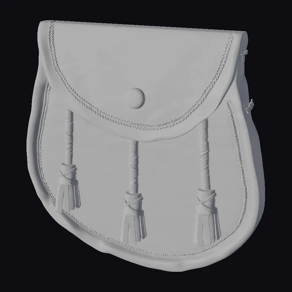 Positioned with its flap open, showcasing the intricate details within, this sporran model boasts a beautifully rendered leather exterior. The three tassels hang elegantly, each wrapped with precision. The texture of the leather is finely detailed, capturing the subtle patterns and sheen of genuine material. The sporran’s design is quintessentially Scottish, making it perfect for historical or cultural projects. Its detailed appearance makes it suitable for close-up shots in animations, games, or virtual reality experiences. Designers can also use this model to create realistic environments or to add an authentic touch to character designs.