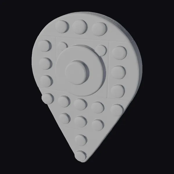 Floating dynamically against a clean backdrop, this Lego-style location pin backpack showcases its unique design. The body of the backpack is a bright red hue, covered in small, round studs characteristic of Lego bricks. A large, yellow circular piece sits prominently in the center, mimicking the appearance of a pin or a marker. The shape of the backpack is a teardrop, with the pointed end facing downwards, giving it a fun and quirky appearance. The overall design is playful and eye-catching, making it perfect for use in creative projects such as games, 3D printing, VR/AR experiences, animation, and design. Its stylized look can add a touch of whimsy to any scene or character.
